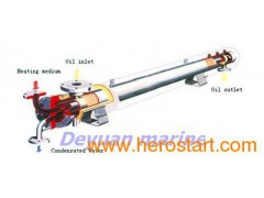 Oil heater for marine boiler China Deyuan Marine Fitting Co.,ltd . Pin-tube oil heater consists of an outer shell and an inside shell with pin tube extended heat surface. It is used for heating of different oils, for example, boiler oil, diesel fuel-oil, lubricating oil, fuel oil in purifier, oil in oil storage tank etc., so that it is popularized in shipyards, power plant, chemical industry, petroleum industry etc. At the same time, the pin-tube extended heat surface is surrounding the oil in this pin-tube oil heater, which is more effective for heat transferring, small cubage, light weight etc. when the oil pass the pin-tube heat-transferring surface, a turbulence will come out to self-wash the heat-transferring surface, therefore, the pin-tube oil heater will not blocked by the deposited dregs and will run effectively for a long time. Because of the pin-tube oil heater's simple structure and good pressure-resist function, the possibility of leakage doesn't exist; it can work in any rigor condition for a long time.2. specifications and typical structuresWhatever products you will choose decided by what cubage and usage you need. The pressure surrounding the oil are PN0.6Mpa, PN1Mpa, PN2Mpa, PN4Mpa, PN6Mpa, the oil flow 0.05m3/h~ 500 m3/h. the heating medium materials are steam below 2.5Mpa,high-temperature water, other heating medium materials.