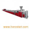 Wood plastic profile machine 1. Max productionwidth: 1200mm 2. Material: PP, PE, PVC 3. Certificate: CE, ISO 4. Extruder: Conical The wood plastic extrusion line undergoes special design of screw, barrel and mould, together with different extrusion technical process. The production line can adopt either double stage extrusion or two steps extrusion after Pelletizer. It is energy saving and room saving too with high output capacity. Special designed screw makes cutting force small and keep the material in the barrel with even time. The barrel adopts dual metallic material which boasts long life and anticorrosion. The production line has a wide application to flooring, out door decoration material, package panel and tray. It is suitable for PVC PE PP material. Besides, the ingredient of wood powder can reach 50% to 75%.