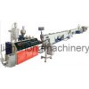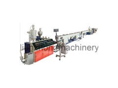 PP/PE pipe production line is mainly used to machining and manufacturing for PP/PE plastic pipe. Configuration: 1. SJ65/33 single Screw Extruder 1.1 Barrel and Screw Screw diameter: 65mm L/D ratio: 33: 1 Maximum rotating speed of screw: 94rpm Barrel: 38CrMoAlA, Nitrogen treatment, Water-cooling for feeding Screw: 38CrMoAlA, Nitrogen treatment 1.2 Heating and Cooling System Barrel heating power: 16.4kw (Germany technology cast aluminium heater) Barrel cooling power: 4× 0.37kw air-cooling 1.3 Driving System Motor power: 45KW, direct-current dynamo Rotating Speed: 1480rpm Reduction box: High torque, Hard-faced gear, low noise(adopting Italy technology produced) 1.4 Control system TENGEN Breaker RKC Temperature controller Schneider Contactor YASKAWA Inverter 2. Hopper dryer Maximum load: 50kg Heating Power: 6kw, heated-air drying Power of Fan: 0.37kw Accuracy of temperature: : 3centigrade Supreme heating temperature: 110centigrade 3. Automatic feeder Feeding style: Vacuum automatic feeding Motor power: 1.1kw Rotating Speed: 2800rpm Delivery capacity: 150kg/h 4. Single screw marking extruder Screw and barrel are adopting Germany technology produced YASKAWA frequency inverter Barrel: 38CrMoAlA, Nitrogen treatment, Water-cooling for feeding Screw: 38CrMoAlA, Nitrogen treatment RKC Temperature controller Screw diameter: 20mm L/D ratio: 20: 1 Drive motor power: 1.1KW Speed Ratio: 289 5. Vacuum shaping tank Tank made of stainless steel Strong spray cooling Length: 6m Vacuum degree: -0.03~-0.08MPa Vacuum pump: 2.2 KW× 2 sets (YULONG Shanghai) Water pump: 3 KW× 2 sets (YULONG Shanghai) Speed of exhaust: 2× 40 CBM/H Front and back moving range: ± 500mm Up to down moving Dimension: ± 50 mm Right to left moving Dimension: ± 30 mm 6. Water Cooling Tank Material: Stainless steel Water spray cooling Controlling device for water temperature Length: 6m Water pump: 3KW(YUHUANG Shanghai) 7. Caterpillar haul-off machine Up and Down Caterpillars YASKAWA Frequency inverter Drive motor power: 1.1KW× 2 sets Frequency Inverter: 2.2KW Max traction: 8000N Max haul-off speed: 10m/min Effective length: 1000mm 8. No-dust cutter Cutting mode: Saw bit cutting Cutting motor power: 2.2KW Saw bit diameter: 60mm Cutting size: φ 20~φ 63 Electric control: Adopting PLC program control 9. Stacker Automatic loading Length: 6m Automatic overturn 10. Extrusion mould Mould body GM63 Size: Φ 20Φ 25Φ 32Φ 40Φ 50Φ 63 (one pressure rating) Adopting Germany technology produced (basket type construction) Main parts adopt high quality alloy steel Runner face with Nitrating Polish treatment Mould cavity: Φ 20Φ 25Φ 32Φ 40Φ 50Φ 63