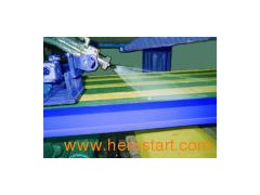 Main Features of SP-9 Z-Look EPS/Mineral Wool Sandwich Panel Production Line: 1. The SP-9 Z Lock Colored Steel Sandwich Panel production line mainly consists of the Corrugated Roll Forming Machine and the Colored Steel Sandwich Panel Laminator. With this machine colored steel wall panels or colored steel roof panel can be produced in just one-time, and the Corrugated Roll Forming Machine and the Sandwich Panel Laminator can work independently. The whole production line of the Corrugated Roll Forming Machine consists of the uncoiler, cold-bending roll forming machine, cutting device, whereas the Sandwich Panel Laminator consists of the uncoiler for colored steel, EPS block, or mineral wool panel, shallow wave for wall panels pressing device, extruding system, mixed-glue spraying, heating and pressurizing system, sandwich, flat curling, edge rolling, edge-turnover, grooving, edge-trimming device, pneumatic clamping device, automatic plastic film coating device, automatic cutting, product stacker; 2. The transmission of the sandwich panel laminator uses worm-worm gear transmission system, ensuring that lamination speed is stable and lamination is uniform; 3. The sandwich panel laminator uses the frequency regulator to automatically cut according to the pre-set sandwich panel length; 4. The sandwich panel laminator uses rubber-coated roller type laminator to protect the color paint on the colored steel as well as during the pressurizing of the sandwich panel; 5. The sandwich panel laminator has a high quality and thick wall rectangular steel welding method, and to get rid of the rust, polishing, smoothing and aging treament;