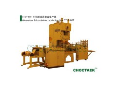 Disposable aluminium foil container making machine CTJF-60T can produce aluminium foil food containers, dishes and trays. The working speed of making machine CTJF-45T is 40-60 PCS/min, and its speed depends on container's size and complexity. Disposable aluminum foil container making machine CTJF-60T is composed of the followings: 1. Decoiler (with an auto-lubricator) 2. Electrical control panel 3. Foil feeder 4.60 ton pneumatic press 5. Aluminium foil container mould 6. Container collector(semi-auto or full-auto) 7. Collection desk Main Features: (1)This full making machine work automatically. Worker control and regulate this plant through electric control panel, including the air-pressure and electricty. (2)The Max. Width of decoiler is about 650mm. The Max. Diameter of foil roll is 760mm. (3)There is an auto-lubricator on the feeder, which can lubricate aluminium foil automatically. (4)The foil feeder provides the supply of right quantity and length of aluminium foil, and it is controlled by computer, which assure a high-precision step. (5)The press can be equipped with single cavity or multi-cavity moulds for producing wrinkle-wall or smooth-wall container. It is equipped with a mould lifter which can lift and low the mould automatically when change a mould. (6)We can design and manufacture different machines on different customers' request. The working flow of making machine CTJF-60T: Aluminium foil roll---decoiler---foil feeder---60T pneumatic press---mould---container collector--- collection desk