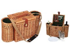 Picnic basket for 2 persons use. Consist of each 2pcs stainless steel w/wood handle spoons,knives & forks ,2pcs ceramic plates,1pc corkscrew,2pcs napkins,2pcs wine goblets.