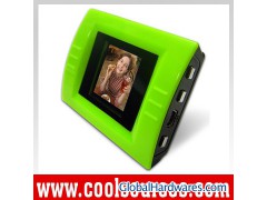 * Display: 1.44-inch CSTN color screen * Memory: 8MB built-in flash memory * Digital Photo Frame, Support BMP, JPG format * Multi-Function: Clock, brightness controlling, ON/OFF automatically * Image resolution: 128 x 128Pixels * Photo storage: avg 80 pictures * Power: 2*AAA batteries * Control buttons including change photo and slideshow mode * Interface: USB 1.1 * Play mode: manual / automatic play Color: * Silver, White, Pink, Green, Orange