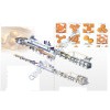 Biscuit processing line: BWD automatic biscuit processing line, with original design, compact structure and high automatic, is developed on the base of absorbing Japanese technology. All working procedures that from feeding, calendering, shaping, wastage recovering, drying to cooling can be accomplished at the same time. Hundreds of moulds and dozens of technology formulas make it possible to produce all kinds of popular biscuits, such as cream biscuit, layer biscuit calcium biscuit, multi-vitamin biscuit, vegetable bisuit, etc. 1. Dough Mixer 2. Moulding Machine 3. Controlling Box 4 Roaster5 Oil Sprayer6Cooling Machine BWD-Complete biscuit producing line may be combined freely according to the condition of customers workshop and requirement of biscuit technology. These all can reach the ideal purpose. The line use imported electric components and its speeds are changed by frequency conversion with high accuracy. Note: 1. Diversified biscuit. The capacity is100-1000kg/H 2. Main electronic equipments are adopted from Siemens. 3. All machines are made by our Company, vendee can check it at any moment during the making period. Processing flowchart Dough making Biscuit forming Baking Oil sprayer Cooling StackingMODEL CAPACITY OVEN LENGTH QH250 80-100KG/HR 16M QH320 150-200KG/HR 24M QH400 300KG/HR 28M QH600 500KG/HR 40M QH800 700KG/HR 40M QH1000 1000KG/HR 60M QH1200 1200KG/HR 60M