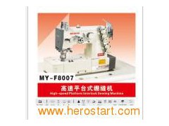 The basic structures and theories of such machine are basically the same as those of the MY-F8007. But, the sewing platform is condensed and redesign has been made to the looper mechanism, the feeding mechanism, the feed lifting mechanism, the needle guard mechanism. As a result, the machine is compacted, reasonable, simple and convenient. In the small spatial range, the ultra-speed rotation can be realized. The stitches are stable and the rotation speed can reach 6000 R.P.M. They are more suitable for the circumferential sewing. After being equipped with accessories, they can be added with other materials to make the synchronous sewing. The change and derivation of assemblies of needle positions can form a new series of machine types. Consequently, the two-needle three-thread, three-needle four-thread interlock stitches and the two-needle four-thread, three-needle five-thread cover stitches can be formed.