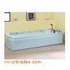 The hydromassage bed is rectangular shape and light blue color.There are a lot of function and equipment inclding multifunctional hand shower,water faucet,cold and hot adjusting switch,head cushion,name brand pump,adjustable nozzles and drainage .