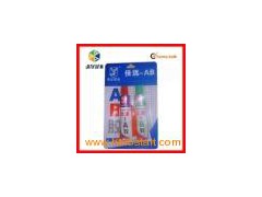 Fast cure time,high solids and strength, heat resisitance, chemical resistance,water resistance, humidity resistanceAB glue/ AB Epoxy Adhesive / AB Epoxy Steel Adhesive / AB SELLICON Resistance Oil and grease. Fast Cure Adhesive Main Component: A component is the modified Epoxy Resin, B component is modified Sulfur hardener Five Minutes Rapid Clear Epoxy Adhesive is based on the room temperature, having the features of: (1) solidifying rapidly within 3-5 minutes, (2) suitable for small parts and structural strength (3) can be used after one hour (4) quick set and high adhesive performance (5) can be lacquered and waxed (6) waterproof and chemical medium (7) joint layer is clear and elastic