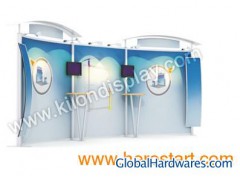 New design Quick Exhibition Solutions Trendy and modern, our exclusive custom portable display lines capitalize on lightweight aluminium and large billboard graphics. Not only do custom portable displays look stylish, but you can customize many features and add functionality, like storage areas, counters. New topper pattern, with the unique light effect. Making your show more modern sense! Main Parts: Frame: 5430*2200mm*1 Header Board*2 V Shape Table*2 L CD Display Mount*2 Spotlights*6 Curved Sign Board*2(L&R) Packing Box: 2 Shipping Weight: 103kgs Quick Exhibition Solutions Display Structure Novel design, durable and lightweight aluminum structure, These extrusions give your company a clean, professional Look. Graphic lnformation Digital sublimation transfer printing is becoming the newest Popular graphic design in the trade show industry, it hits Your show with a bold new look, also has the features of Lightweight, easy to fold and transit. Tabletop Quick Exhibition Solutions Quick Exhibition Solutions add the Tabletop Quick Exhibition Solutions, this system use form of pictorial graphic, legerity look, simple structure and easy to install. Custom Exhibition Solutions There are a wide variety of customizable options for our Smart system sc series, if you have specific needs with our supplied products to display your product, give us a call to make a customized booth solutions for you. Setup time: One hours to two hours Turnaround Time: 10working days Packing: Deluxe hard case Ships: Express delivery or as air-transit