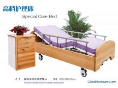 Double-crank bedWooden manual hospital bed with double cranksDimensions: 2, 070 x 1, 000 x 530mm Properties: The head and foot of the bed is adopt willow. Bed board is made from cold-roll steel sheets. Punching press and shaping in one time. Bed platform becomes of four sections metal sheet owing to ventilation holes bended downwards to easily clean and protect mattress to the external effects. Backrest adjusted by rotate of mechanical handle between 0 to 70° Is located under the leg rest of the bed. Leg rest adjusted by rotate of mechanical handle between 0 to 35° Is located under the leg rest of the bed. Ergonomic, strong, and useful side rail system is optional. Electrostatic painted steel construction. Moves easily by 125mm diameter casters with brake to fix the position. ABS crank handle with over-loading protection system. Material: Willow, cold rolled steel sheets, ABS. Certificate: ISO9001: 2000 and ISO13485: 2003. Features: Stable, durable, lightweight, flexible to move, and sound proof.