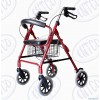 Aluminum RollatorAluminum liquid coated frame. Can be easily folded for storage and travel. Removable two-position basket with handle, to be put in front of the rollator or under the seat. Easy squeeze and release hand brakes come with locking mechanism. With 8'' wheels. PVC seat.