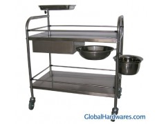 Spec: 640*420*800 mmAll stainless steel2 S/S shelves with guard rails on 3 sidesWith 1 wastebin & 1 S. S bawlS. S. Dressing tray attached at the top1 S/S drawer below the first shelf4 swivel castor (all with brakes) Model NO.: MT-004 Unit Price/Payment: T/T or L/C Company: Yongkang Donglong Import & Export Co., Ltd.