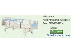 Item No.: TW-A04Name: ABS manual nursing bedSpec.: 2120x970x485mm Trademark: TW Model NO.: TW-A04 Productivity: more than 100, 000 sets/year Company: TW Medical Equipment Co., Ltd.