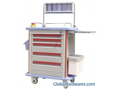 High-strength alloy ABS boards & cart's bodyStainless steel guard rail, Centralized lockDust basket, Utility container, File bag, Sliding side shelf, Needle disposal holderMulti bin containerFive ABS drawers: 3 big, 2 small each inner with partitions can be organized freely into different size units---5ABSFour luxurious noiseless casters, two with brakesHigh-quality aluminum columns