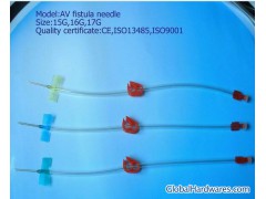 AV fistula needle1. Size: 15G, 16G, 17G. 2. With back eye and without back eye. 3. The products are made by medical polymer materials, sterilized by EO gas, sterile, non-toxic, pyrogen free. 4. Quality certificate: CE0197/ISO13485/ISO9001/CMD. More Product Features HS Code: 90183900 Trademark: YIXIN Standard: ISO13485/CE/ISO9001 Productivity: 100000pcs/day Origin: China Packing: Pe Or Blister Min. Order: 5000pcs Company: Jiangxi Sanxin Medical Devices Group Ltd