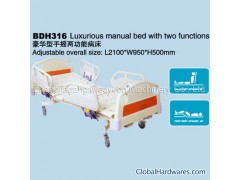 BDH316 Luxurious manual bed with two functionsOverall size: L2100*W950*H500mmMaterial&Introduction: 1. Headboard: ABS Plastic; 2. Railing made of ABS Plastic with 4PCS; 3. Panel, leg and frame are all made of cold-rolled steel plate and tube and coated by electrostatic spray after twice phosphatization; 4. Ordinary wheels with two brakes (Diameter: 125mm).