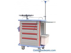 1. High-strength alloy ABS boards& cart's body. 2. Stainless steel guard rail. 3. Dust basket, Utility container, File bag, Needle disposal holder, Sliding side shelf. 4. IV pole, Defibrillator shelf, C. P. R Board, Power outlet&Hooks, Oxygen tank holder5. Centralized lock6. Five ABS drawers: 3 big, 2 small each inner with partitions can be organized freely into different size units. 7. Four luxurious noiseless casters, two with brakes. 8. High-quality aluminum columns.