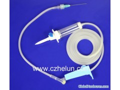 Roduct name: Infusion setDescription: 1, PVC tube, lenght: 150cm, 200cm2, ABS or PE flow regulator3, PVC medium drip chamber4, PVC air filter 5, ABS butterfly closure-piercing device6, PE protective cap for closure-piercing device7, ABS fluid filter8, ABS rubber connector9, three adapter injection site10, MBS male conical fitting 11, infusion needle( PP304 needle)12, PE protective cap for infusion needlePacking: Sinlge PE or compound film or blister individual package, 20PCS/large PE package then 400PCS/carton; 80PCS/box then 320PCS/cartonCarton measurement: 59X38.5X39CM