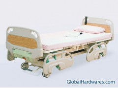 Electric bed that has the additional feature of electric height adjustment, easier to raise and lower for patient care. Steel framework, scratch and chip resistant epoxy coating.