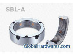 Lock screws intersect at a 30° angle. Superior to traditional locknuts with only 3 lock screws, the SBL-A employ 6 lock screws to the axis. Perfect mesh. Precision and balanced compression. Zero loosening under any load or speed. Inner threads, outer skir