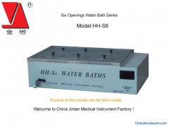 Model HH-S6 Digital Display Double Row Six Openings Water Bath SeriesMain Parameters: 1. Power Supply: AC 220V± 10% 50Hz± 2%. 2. Openings: Six openings in double rows. 3. Temperature Range: Romm temperature to 99 Celsius. 4. Timing Functions: Timing ON/OFF. 5. Material: Stainless steel. 6. Heating Power: 1500W. 7. Temperature Fluctuation: ± 0.3 Celsius. 8. Size: L460 W310 H170 mm. Tips: All parameters can be customized. More Product Features Trademark: Jinyi Model NO.: HH-S6 Standard: A grade Productivity: 50, 000 pcs/year Unit Price/Payment: FOB Shanghai Origin: China Packing: carton or wodden case Min. Order: 1 Transportation: according to customers' need Export Markets: North America, South America, Eastern Europe, Southeast Asia, Africa, Oceania, Mid East, Eastern Asia, Western Europe Company: Jintan Medical Instrument Factory