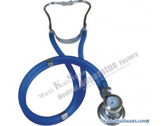 Size of chest piece cover: D1 (adult) 45.5MM, D2 (clock surface) 28MM; Height of chest piece: H 38MM; Length of ear piece plus rubber tube: L 690MM. With a special round body design, this product is intended to be used in identifying high and low heart tones as well as other sounds. Integrating the functions of stethoscope and clock, the chest piece enables medical staff to easily get heart rate and pulse rate, meeting for demand of modern medicine. Made from imported PVC with high durability and resistance to ageing, the conducting tube features a two-channel design to achieve better conducting performance, enhanced volume and balanced auscultation between two ears. Each chest piece is equipped with three sound-collecting bells. They are large, medium and small sizes, which are suitable for auscultation of infants, children and adults as well as fetal heart sound, breath sound, and high and low heart sounds respectively based on the area of auscultation and range of frequencies to achieve an optimal sensitivity of frequency response. Produced from 62 copper with poisonous decorative chrome plating with exceptional surface finish and high durability, the ear piece is designed to be automatically adjustable according to the user's facial form and angle of auricles to achieve an optimal performance of wearing. Manufactured from highly flexible PVC synthetic material, the earphone can perfectly fit the auricle with no sound leakage and feels good in long time use. Moreover, it can be easily disassembled and cleaned to avoiding infection of doctors' ears. Acoustically designed for exceptional sound conduction, this set of stethoscope has up-to-date profile, high portability and a wide range of colors. Trademark: kaishun Model NO.: KS-410B Packing: Colorful Box Company: Wuxi Kaishun Medical Appliance Factory