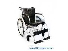 Aluminium anodic oxidation frame, 8" wide front caster and 24" rear wheel, pneumatic tyre, double cross brace, with safety belt, with commode and dinning board.