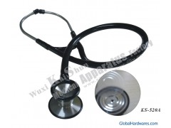 KS-520A stainless steel diechoscopic cardiology stethoscope (with one-sided diaphragm)Size of chest-piece: D1 41MM, D2(clock cover) 37MMHeight of chest-piece: H 34MMLength of ear piece plus rubber tube: L 650MMPacking: colored box with two covers and sponge baseMEAS: 77.7X40X28cmQuantity: 20PCS/CTNN/G Weight: 11/13KGSThe concave-convex patented design enables the product to wag up and down according to the force on it and therefore produce two different acoustic frequencies together with a sound-collecting cavity. With exceptional sound collecting performance to distinguish among high and low heart sound as well as various other sounds, it is the first choice for doctors of cardiothoracic department.Patented designs of vibrating diaphragm and sound-collecting cavity make the auscultation more precision. Doctor can compare high and low tune with the same chest piece cover simply by adjusting the force on the stethoscope.The cover of the chest piece features a high quality PVC non-chill sleeve which feels warm when contacting with human skin at a low temperature and is available in a variety of colors. Model NO.: KS-520A Packing: colorful box with two covers and sponge base Company: Wuxi Kaishun Medical Appliance Factory
