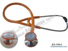 Size of chest piece cover of stethoscopes: D1 (adult) 47MM, D2 (children) 38MM; Height of chest piece: H 31MM; Length of ear piece plus rubber tube: L 650MM. Patented designs of vibrating diaphragm and sound-collecting cavity (patent number: 200520122864. 7 and 200520122862. 8) feature the most valuable effect. When performing auscultation for patients, doctors can get and compare two different sound of high and low tune with the same chest piece cover simply by adjusting the force on the stethoscope so as to obtain more efficient diagnostic basis. This stethoscope uses 180 degree revolving axle to change different sides. This design makes the auscultation more precision and flexible. Besides the distance between the axle and the head is no more than 0. 05mm which avoids the leakage of sound wave. Trademark: kaishun Model NO.: KS-500A Company: Wuxi Kaishun Medical Appliance Factory