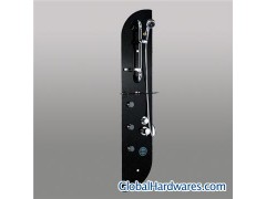 MODEL:KA-F2250 SIZE:158X37CM 1. 8mm thick tempered glass 2. Stainless steel soft pipe. hand shower, sliding staff 3. Faucet with ceramic valve core, hot and cold controller 4. Mixer,multi-directional water out 5. Five hydraulic acupuncture massage spray heads 6. Glass shampoo and towel rack 7. Acryl skirt in the back