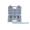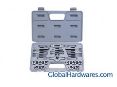 24 pcs Inch Tap and die set Material: HSS, ALLOY STEEL, CARBON STEEL Includes: 5 UNF Taps: 1/4, 5/16, 3/8, 7/16, 1/2 5 UNC Taps: 1/4, 5/16, 3/8, 7/16, 1/2 5 UNF Dies: 1/4, 5/16, 3/8, 7/16, 1/2 5 UNC Dies: 1/4, 5/16, 3/8, 7/16, 1/2 1 NPT Tap:1/8-27 1 NPT Die:1/8-27 1 Tap wrench:1/16-1/2" 1 Die wrench:1" O/D