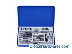 19 pcs Tap and die set Material: ALLOY STEEL, CARBON STEEL,HSS Includes: 5 Dies: 6×1.0, 8×1.25, 9×1.25, 10×1.5, 12×1.75 10 Taps: Size as dies 1 Tap wrench: M3-M12 1 Die wrench: 25mm O/D 1 T type Tap Wrench: M3-M6 1 Screw Pitch Gauge