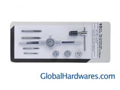 10 pcs Tap and die Set Includes: 4 Taps: 3, 4, 5, and 6mm 4 Dies: 3, 4, 5, and 6mm Die wrench:25mm O/D 1 T-Type Tap wrench:M3-M6
