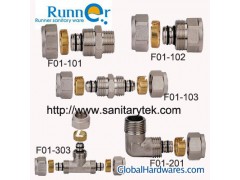Product DescriptionBrass Compression Fitting for multilayer pipe Product Description: F01-101 Straight Nipple Male (nickel plating) Size: 14x3/8", 14x1/2", 14x3/4", 18x1/2", 18x3/4", 20x1/2", 16x3/8", 16x1/2", 16x3/4", 20x3/4", 26x3/4", 26x1", 32x1" 1) Material: Brass 2) Applications: Connecting for PEX-AL-PEX pipes and PE-AL-PE pipes F01-102 Straight Nipple Female (nickel plating) Size: 14x3/8", 14x1/2", 14x3/4", 18x1/2", 18x3/4", 20x1/2", 16x3/8", 16x1/2", 16x3/4", 20x3/4", 26x3/4", 26x1", 32x1" 1) Material: Brass 2) Applications: Connecting for PEX-AL-PEX pipes and PE-AL-PE pipes F01-103 Straight Nipple Double (nickel plating) Size: 14x14, 16x16, 18x18, 20x20, 26x26, 32x32 1) Material: Brass 2) Applications: Connecting for PEX-AL-PEX pipes and PE-AL-PE pipes F01-201 Brass elbow male(nickel plating) Size: 16x1/2",16x3/4",18x1/2",18x3/4",20x1/2",20x3/4",26x3/4",26x1",32x1" 1) Material: Brass 2) Applications: Connecting for PEX-AL-PEX pipes and PE-AL-PE pipes F01-303 Nickel plated equal tee 16x16x16, 18x18x18, 20x20x20,26x26x26,32x32x32, 1816x18, 20x20x16, 26x16x20, 26x20x16,32x26x32 Ningbo Runner Sanitary Ware Co., Ltd. Are manufacturers and exporters of brass fitting, pipe fitting, brass pipe fitting, pex fitting, brass tee, press fitting, compression fitting, elbow fitting, ppr fitting and other sanitary products, such as faucet, ball valve, shower panel, shower room, shower enclosure, bathroom ware, glass basin, bathtub, shower head, ppr pipe, drainer, knitted hose etc. If you are interested in any of our products, please feel free to contact us!