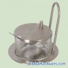 glass sugar can with stainless steel holder,with a stainless steel spoon. material:glass + stainless steel size:Dia11.6 x H13cm