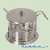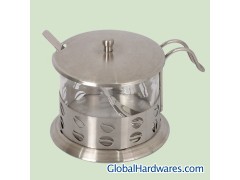glass sugar can with stainless steel holder,with a stainless steel spoon. material:glass + stainless steel size:Dia10 x H9cm