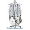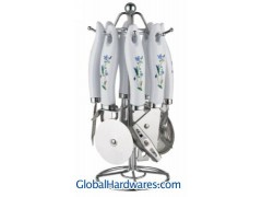 Set includes: can opener, peeler, bottle opener, ice-cream spoon, pizza cutter, tea strainer, knife sharpener and stand. Material: ABS (flower printed) handle + 18/0 stainless steel. With SGS, FDA and LFGB food testing marks. Different handles and colors are available.