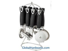 Set includes: can opener, peeler, bottle opener, ice-cream spoon, pizza cutter, tea strainer, knife sharpener and stand. Material: ABS (with rubber finish) handle + 18/0 stainless steel. With SGS, FDA and LFGB food testing marks. Different handles and colors are available.