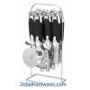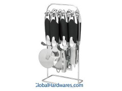 Set includes: can opener, peeler, bottle opener, ice-cream spoon, pizza cutter, tea strainer, knife sharpener and stand. Material: ABS (with rubber finish) handle + 18/0 stainless steel. With SGS, FDA and LFGB food testing marks. Different handles and colors are available.