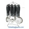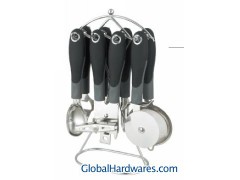 Set includes: can opener, peeler, bottle opener, ice-cream spoon, pizza cutter, tea strainer, knife sharpener and stand. Material: ABS (with rubber finish) handle + 18/0 stainless steel. With SGS, FDA and LFGB food testing marks. Different handles and colors are available.