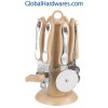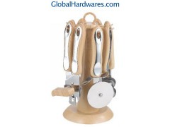 Set includes: can opener, peeler, bottle opener, ice-cream spoon, pizza cutter, tea strainer, knife sharpener and stand. Material: ABS (wooden color) handle + 18/0 stainless steel. With SGS, FDA and LFGB food testing marks. Different handles and colors are available.