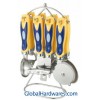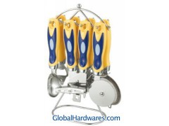 Set includes: can opener, peeler, bottle opener, ice-cream spoon, pizza cutter, tea strainer, knife sharpener and stand. Material: ABS handle + 18/0 stainless steel. With SGS, FDA and LFGB food testing marks. Different handles and colors are available.