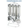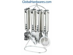 Set includes: can opener, peeler, bottle opener, ice-cream spoon, pizza cutter, tea strainer, knife sharpener and stand. Material: 201 stainless steel handle + 18/0 stainless steel. With SGS, FDA and LFGB food testing marks. Different handles and colors are available.