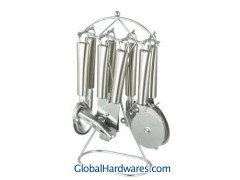 Set includes: can opener, peeler, bottle opener, ice-cream spoon, pizza cutter, tea strainer, knife sharpener and stand. Material: 201 stainless steel handle + 18/0 stainless steel. With SGS, FDA and LFGB food testing marks. Different handles and colors are available.