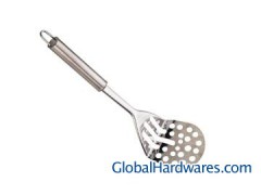 STAINLESS STEEL ROUND HANDLE POTATO MASHER L*W*H:280*80*70MM, NET WEIGHT:92G SUS304 18-8 stainless steel material, thickness:1.0MM, stainless steel handle, using part is SUS304 18-8 stainless steel materia with brightness well with polished.