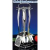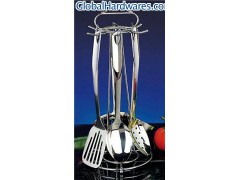 7 PCS STAINLESS STEEL KITCHENWARE:TURNER,FORK,SPOON,SKIMMER,SOUP LADLE,SPAGHETTI AND STAINLESS STEEL STAND。 SUS304 18-8 stainless steel material, thickness:2.5MM, All stainless steel,whole part of this item just one part material without welding, with brightness well with polished. PACKING:pc/polybag, 6PCS with stand in color box, 9 sets in export carton. MEAST.56*56*44CM 1X20’FT:1980 SETS