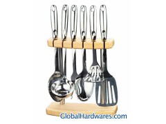 7 PCS STAINLESS STEEL HOLLOW HANDLE KITCHENWARE:TURNER,FORK,SPOON,SKIMMER,SOUP LADLE,SPAGHETTI AND WOOD & STAINLESS STEEL STAND。 SUS304 18-8 stainless steel material, thickness:2.5MM, hollow handle, using seamless welding technology, no traces of the surface, with brightness well with polished. PACKING:pc/polybag, 6PCS with stand in color box, 8 sets in export carton. MEAST.60*56*31.5CM 1X20’FT:2160 SETS
