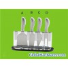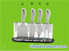 4pcs Stainless steel cheese knife set with Acrylic block: *Including:wide blade cheese knife, a bell shape, a serving fork and a slicer.Thickness:1.5mm.each set in a Acrylic block.*This cheese knife set makes the perfect accent for your holiday entertaining. *Each piece is made from the high quality S.S.420&S.S.430.*Each piece is made in the traditional shape and each one has a distinct use.Packing details:each set in a color box,24sets/ctn,46.5*35.5*20cm/ctn.