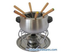 This stainless steel fondue set includes:1pc fondue pot, 1pc cover, 1pc wire stand, 1pc burner, 1pc saucer, 6pcs woodhandle forks. It can be used with meat, cheese, fruit.etc