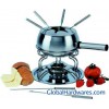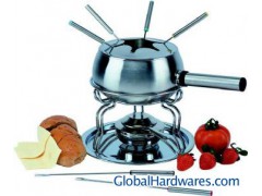 6 pcs 3mm 18/8 s/s fork with s/s tube handle. 1 pc 0.7mm 18/8 s/s pot with single s/s handle 1 pc 0.6mm 18/8 s/s splatter cover. 1 pc steel c.p. wire stand1 pc steel c.p. base1 pc steel c.p. burner