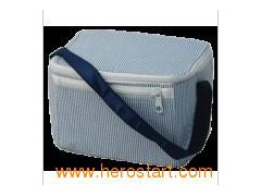 Cooler bag(MS3091) Description: Front zippered pocket. Crisp blue and white seersucker fabric with navy ribbon handle. We embroider on the front pocket. Size: 9" x 9" x 6"